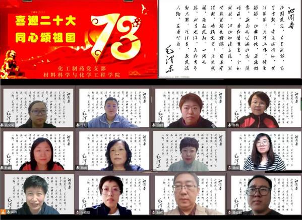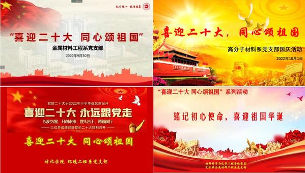 为进一步贯彻落实习近平新时代中国特色社会主义思想,加强爱国主义教育,弘扬爱国主义精神,2022年9月30日——10月1日哈尔滨理工大学材料科学与化学工程学院开展了“喜迎二十大 同心颂祖国”系列活动,本次活动以党支部为单位,线上集体重温入党誓词、共唱爱国歌曲、诵读经典名著,表达爱国情怀,庆祝祖国73周年华诞,喜迎党的二十大胜利召开。