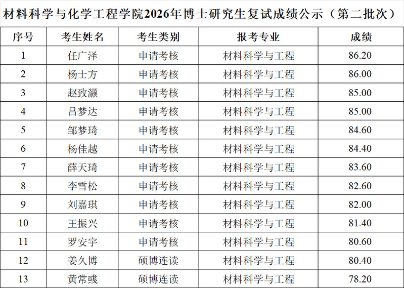 根据《哈尔滨理工大学博士研究生招生工作管理办法》,现将材料科学与化学工程学院2026年博士研究生(第二批次)复试成绩公布如下。