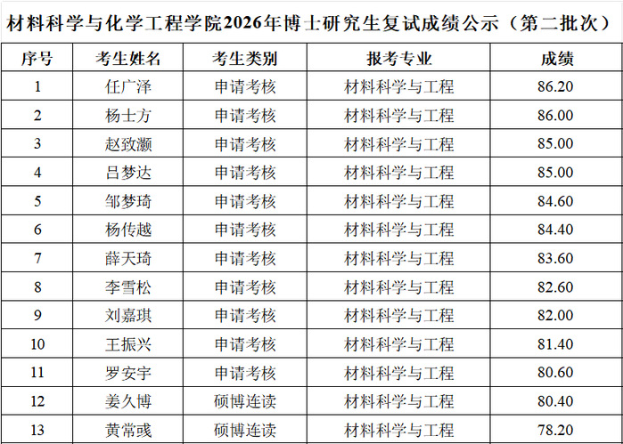 根据《哈尔滨理工大学博士研究生招生工作管理办法》,现将材料科学与化学工程学院2026年博士研究生(第二批次)复试成绩公布如下。